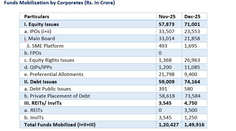 There were 03 main board IPOs in January 2026 including Bharat Coking Coal Limited, Amagi Media Labs Limited, and Shadowfax Technologies Limited, against 10 main board IPOs in December 2025. There were 10 SME IPOs in January 2026 as compared to 15 SME IPOs in December 2025.
