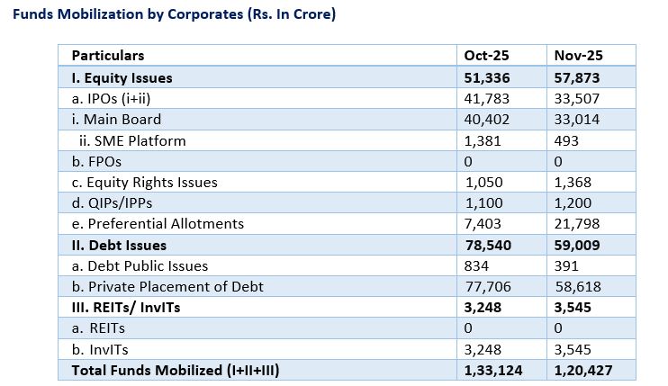 There were 10 main board IPOs in December 2025 including Meesho Limited, Aequs Limited, Vidya Wires Limited, Corona Remedies Limited, Wakefit Innovations Limited, Nephrocare Health Services Limited, Park Medi World Limited, ICICI Prudential Asset Management Company Limited, KSH International Limited and Gujarat Kidney & Super Speciality Limited, against 12 main board IPOs in November 2025. There were 15 SME IPOs in December 2025 as compared to 6 SME IPOs in November 2025.