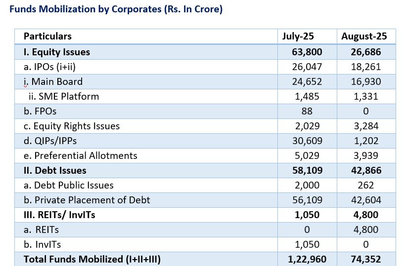 There were 17 main board IPO in September including of Vikram Engineering Limited, Anlon Healthcare Limited, Amanta Healthcare Limited, Shrinagar House of Mangalsutra Limited, Urban Company Limited, Dev Accelerator Limited, Euro Pratik Sales Limited, VMS TMT Limited, Ivalue Infosolutions Limited, GK Energy Limited, Saatvik Green Energy Limited, Ganesh Consumer Products Limited, Atlanta Electricals Limited, Solarworld Energy Solutions Limited, Jaro Institute of Technology Management & Research Limited, Seshaasai Tecgnologies Limited and Anand Rathi Share and Stock Brokers Limited against 16 main board IPOs in August 2025. There were  21 SME IPOs in September 2025 as against 12 SME IPOs in August 2025.
