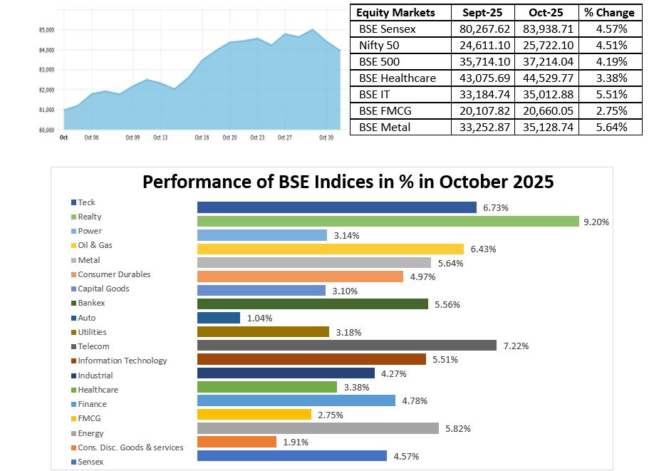 - The BSE Sensex closed at 83,939, up by 4.57%, and the Nifty 50 closed at 25,722, up by 4.51% in October 2025, supported by stronger earnings expectations, positive global cues, and renewed FII buying after three months of outflows.