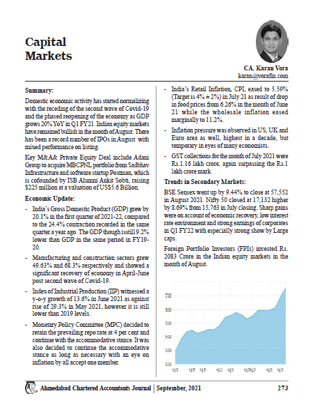 Domestic economy has started normalizing with the receding of the second wave of Covid -19 and the phased reopening of the economy as GDP grows 20% YOY in Q1FY21. Indian equity markets have remained bullish in the month of August.